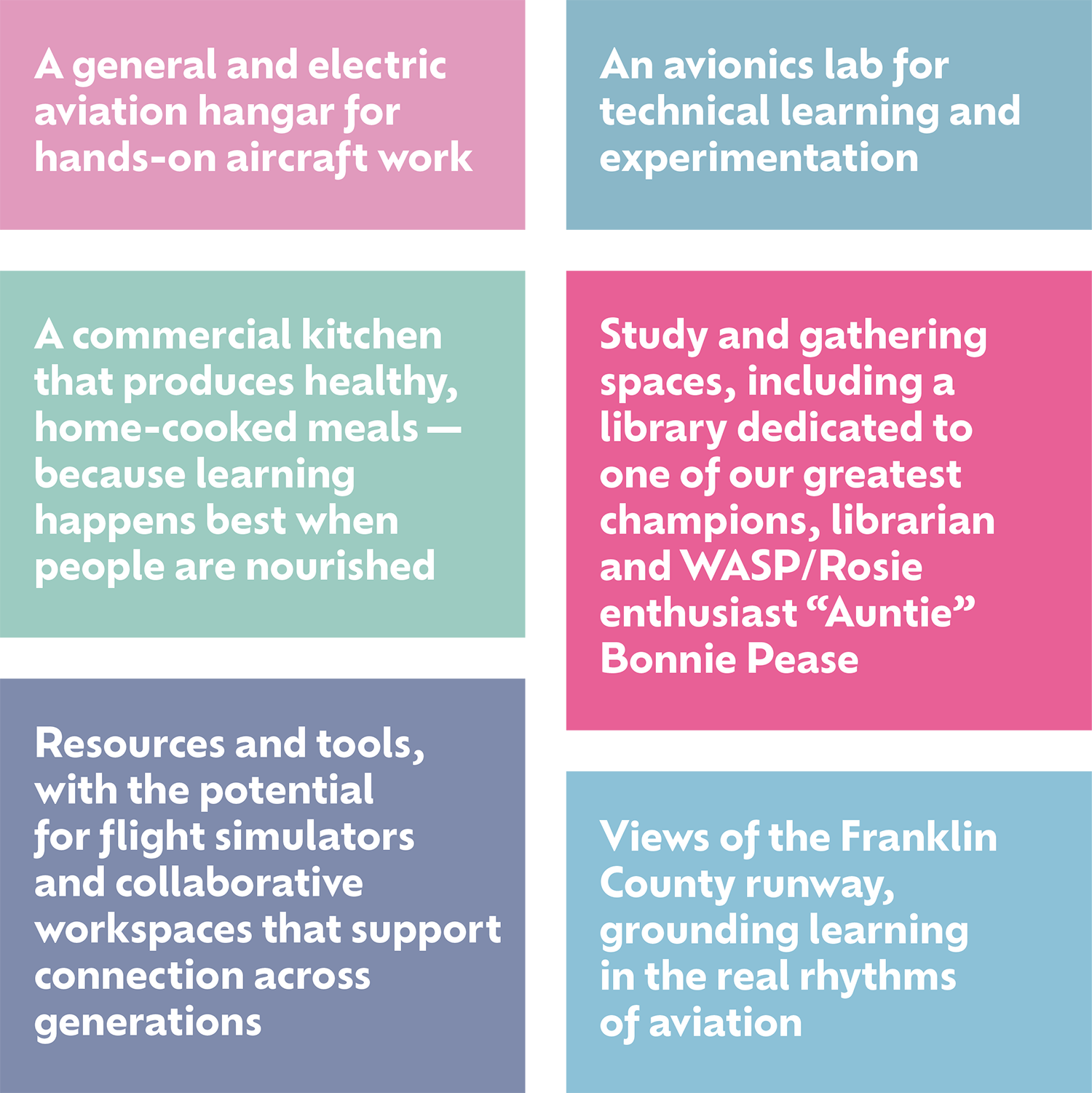 Developed in collaboration with BETA Technologies, our concept design is in the planning stage and centers learning, mentorship, and personal growth. Every space will support hands-on skill building, curiosity, and belonging—opening pathways into aviation for those ready to work with their hands and their minds.